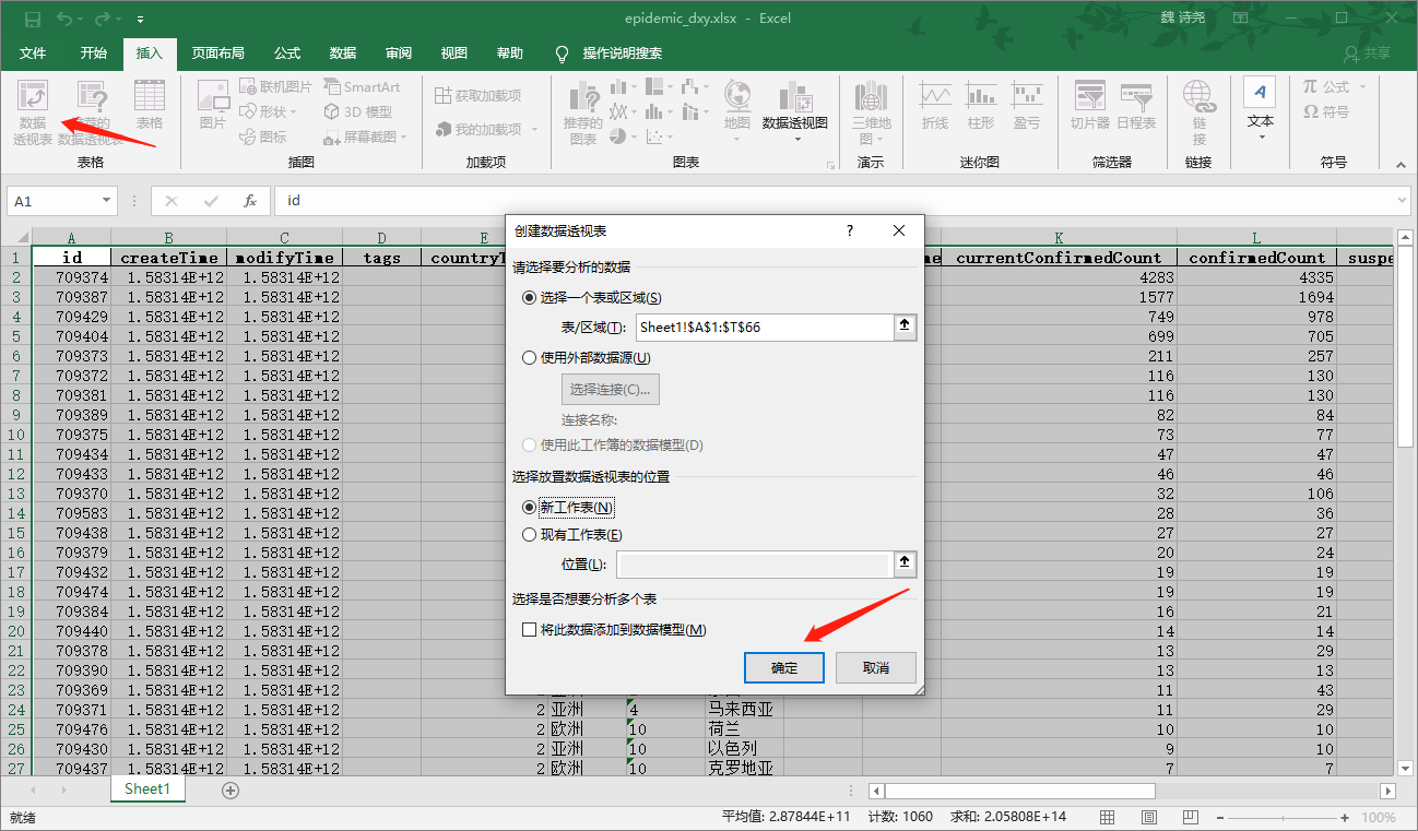 在 Excel 中,其实也有数据透视表这个东西,在插入中全选数据后点击数据透视表,就会出来这么个东西: