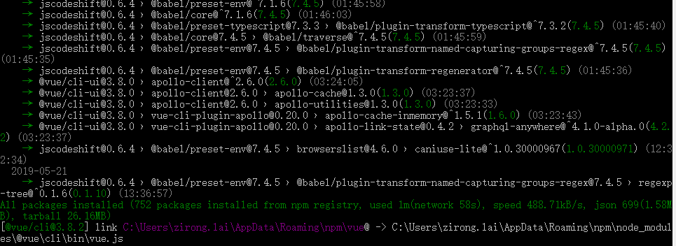 3.安装vue-cli3.x版本:cnpm install -g @vue/cli