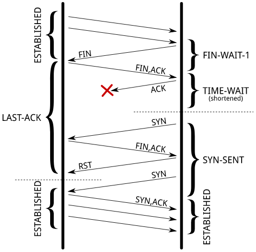 一旦客户端用新的连接替代了 TIME-WAIT 状态的连接,客户端发出 SYN 报文后服务端重传 FIN 报文(因为时间戳的关系,服务端识别出是新的连接,客户端的 SYN 报文被忽略)。因为客户端当前处于 SYN-SENT 状态,所以会回复 RST,这使得服务端能正确脱离 LAST-ACK 状态并关闭连接。这之后,SYN 初始化报文会重发,重新进入新连接的建立流程: