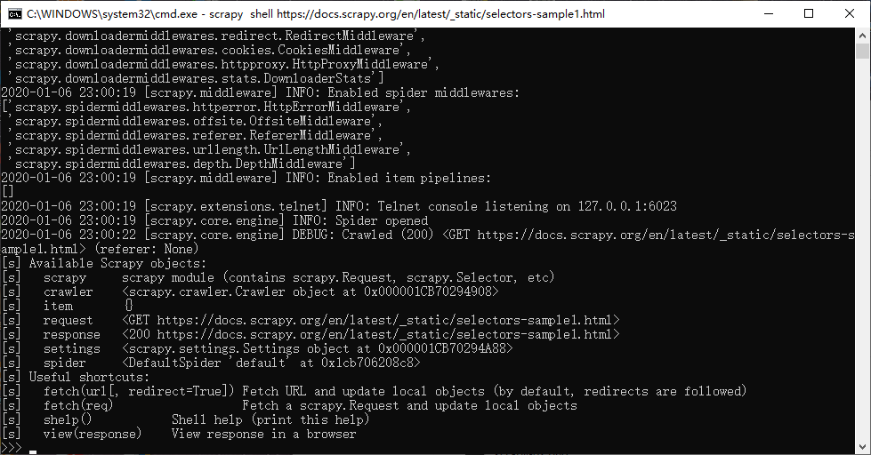 首先,让我们开启 Scrapy shell,在命令行输入如下命令: