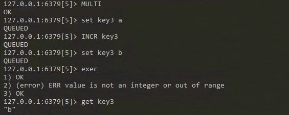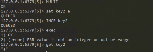 key2被设值为'a',这一步是成功的,但incr 只能对数字进行操作,而'a'为字符串,显然会出错,但是查询key2结果,发现值还是'a',并未进行回滚,说明一个命令失败,不会整个队列命令失败,也就是说,redis不能保证原子性