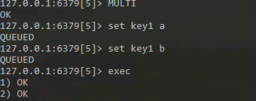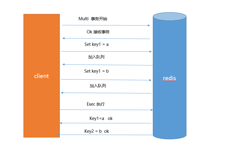 在redis中,事务的multi命令后的操作,都将顺序生成在一个队列中,命令不会立即执行,队列中所有的命令会等待exec命令的提交后,才会被一次性执行