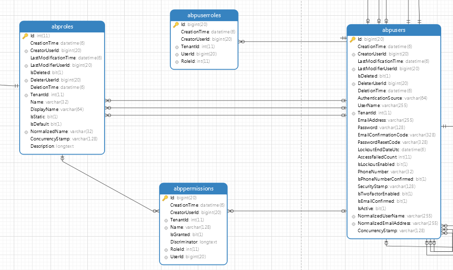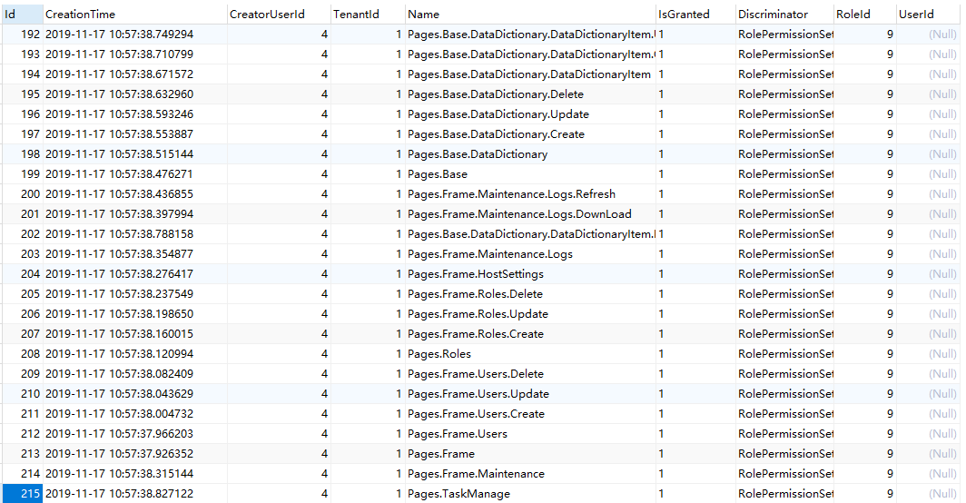 指定角色Id,租户Id及之前声明的权限名称,在abppermission中可查看到具体角色权限。
