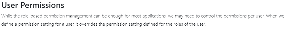 此处对用户个人单独的权限没有去做处理,依照Abp的文档有那么一句话,大多数应用程序中,基于角色的已经足够使用了,如果想声明特定权限给用户,那么针对于用户本身的角色权限则被覆盖。