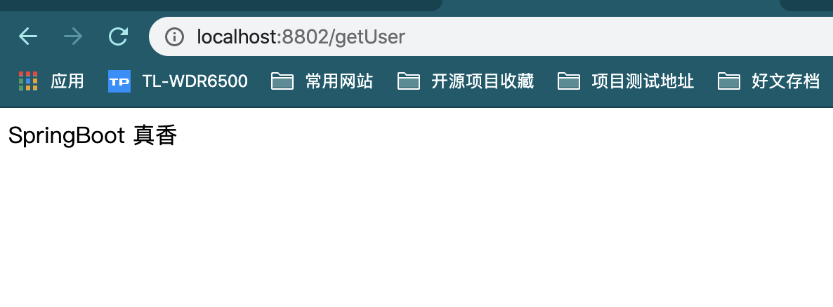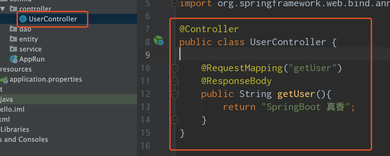 创建UserController类,类中定义 getUser() 方法 该方法会以Json的方法返回一句话:SpringBoot 真香。