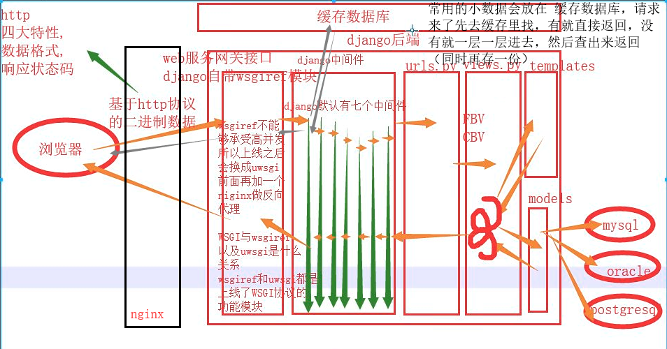 - wsgiref 不能够承受高并发,所以上线之后会换成 uwsgi 模块(前面再加一个 nginx 做反向代理)