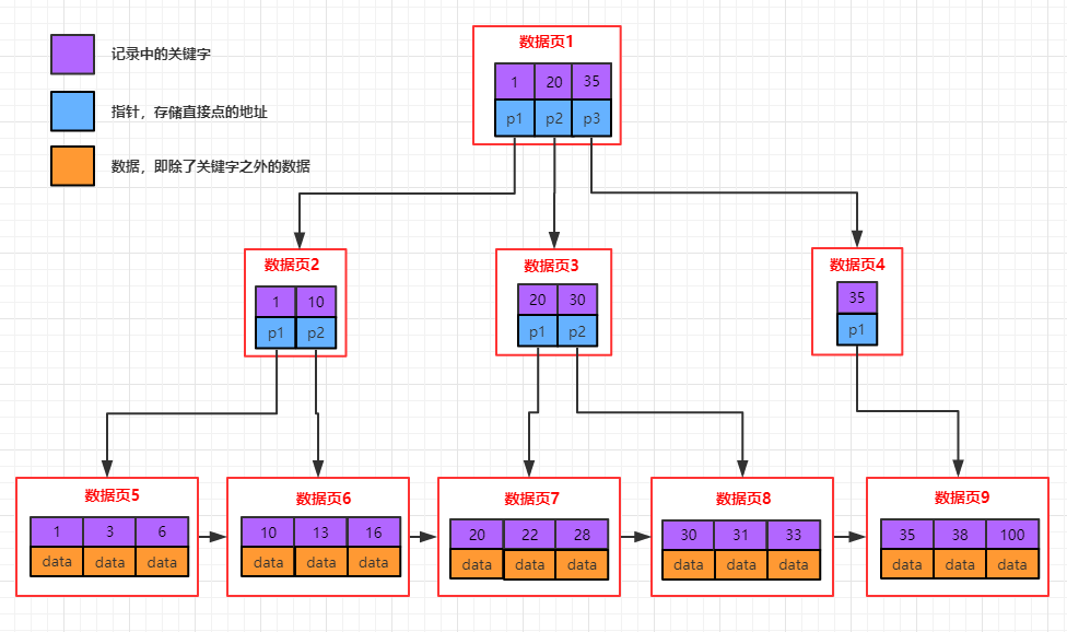 - 叶子节点包含了所有数据的关键字以及data,叶子节点之间用链表连接起来,可以非常方便的支持范围查找
