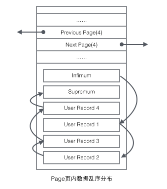 再看看Page的主体内容,我们主要关注行数据和索引的存储,他们都位于Page的User Records部分,User Records占据Page的大部分空间,User Records由一条一条的Record组成。在一个Page内部,单链表的头尾由固定内容的两条记录来表示,字符串形式的"Infimum"代表开头,"Supremum"代表结尾,这两个用来代表开头结尾的Record存储在System Records的,Infinum、Supremum和User Records组成了一个单向链表结构。最初数据是按照插入的先后顺序排列的,但是随着新数据的插入和旧数据的删除,数据物理顺序会变得混乱,但他们依然通过链表的方式保持着逻辑上的先后顺序,如下图: