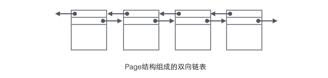 我们重点关注和数据组织结构相关的字段:Page的头部保存了两个指针,分别指向前一个Page和后一个Page,根据这两个指针我们很容易想象出Page链接起来就是一个双向链表的结构,如下图: