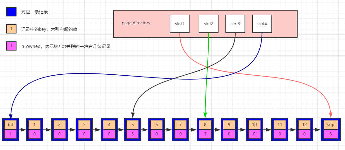 看上图,每个行记录的都有一个n_owned的区域(图中粉色区域),n_owned标识所属的slot这个这个块有多少条数据,伪记录Infimum的n_owned值总是1,记录Supremum的n_owned的取值范围为[1,8],其他用户记录n_owned的取值范围[4,8],并且只有每个块中最大的那条记录的n_owned才会有值,其他的用户记录的n_owned为0。