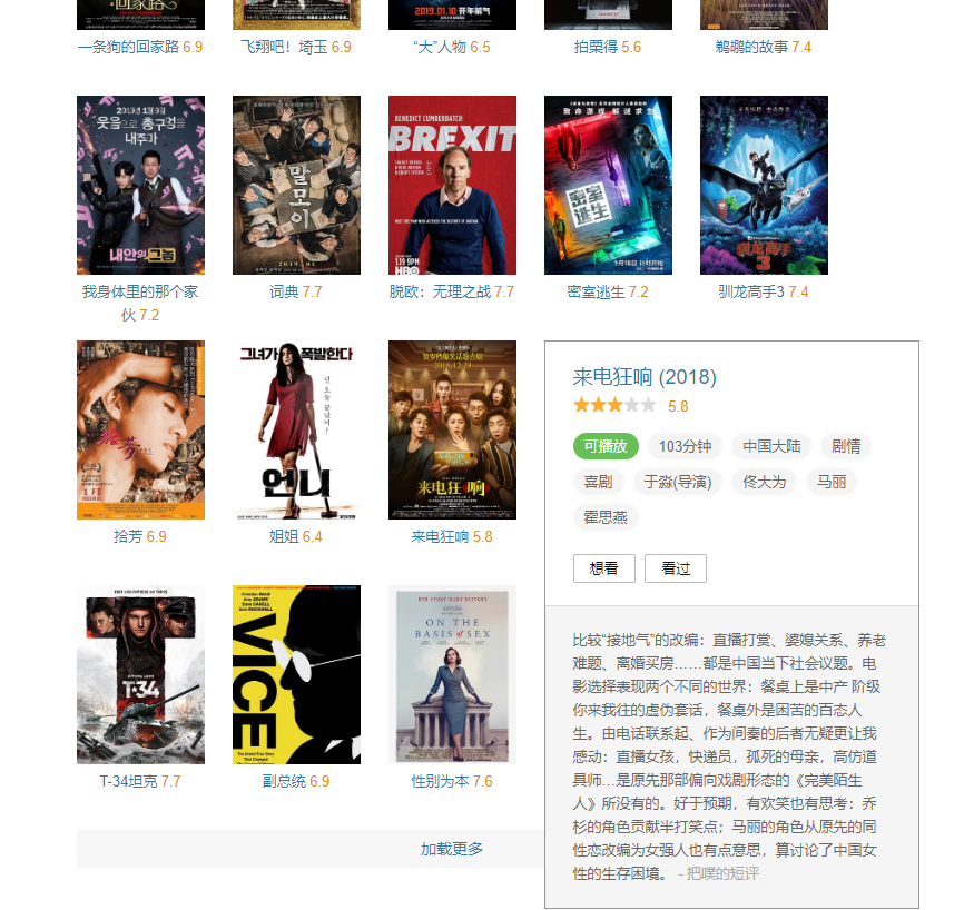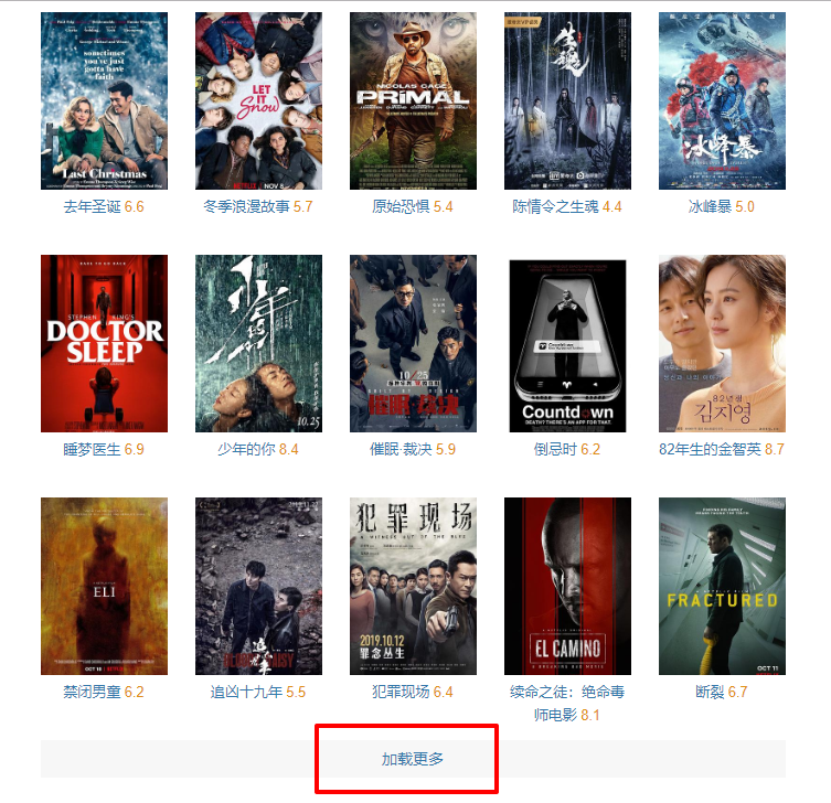 加载更多多点几次,可以发现,这里的电影是可以一直往后排的,可以加载到 2018 年的数据: