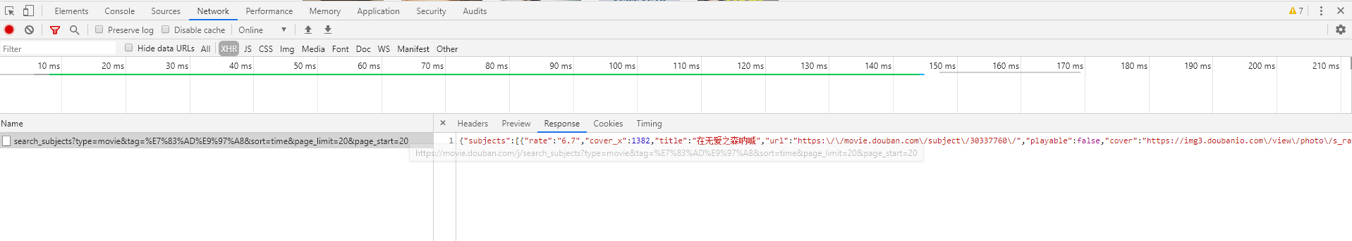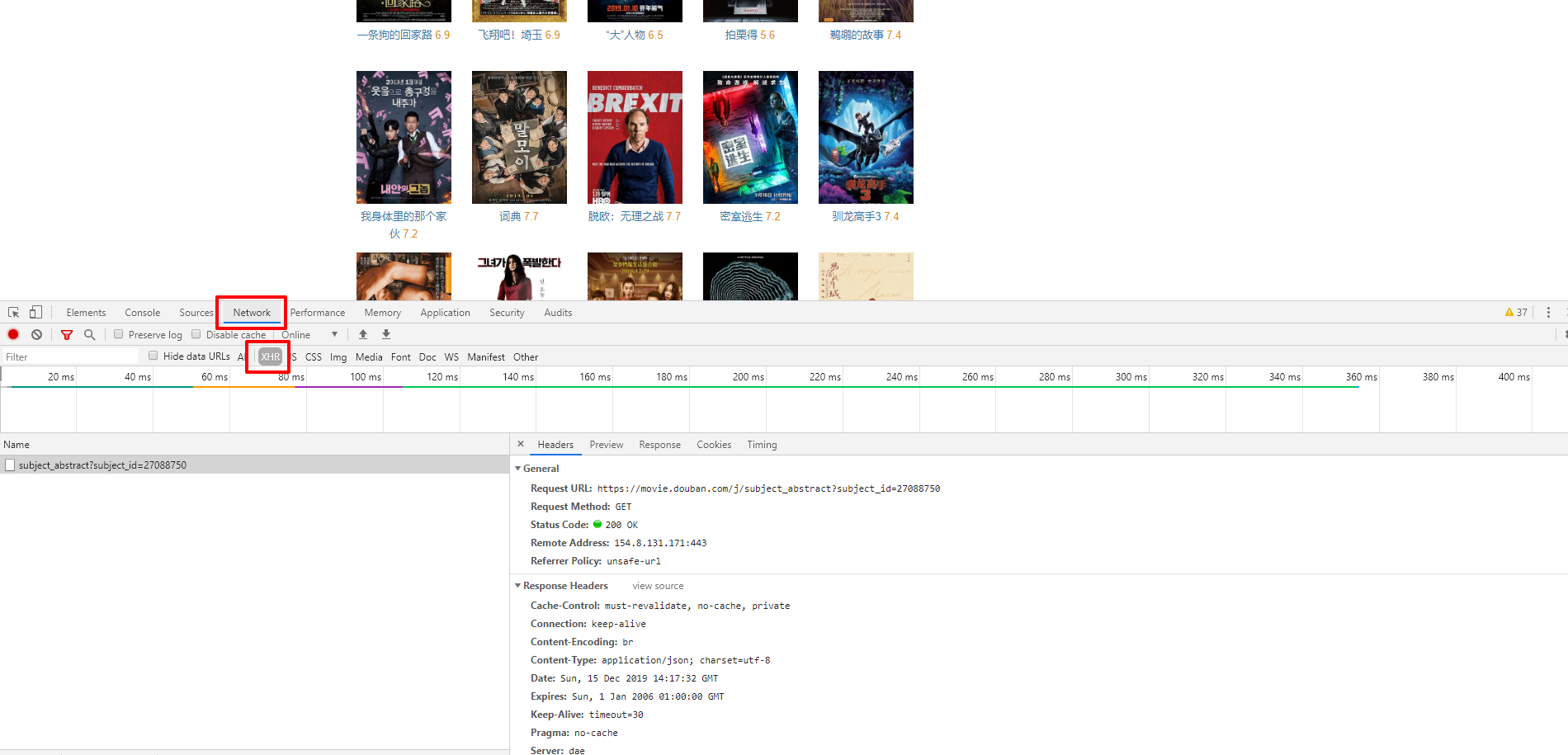 首先选择 Network 标签,然后在下面的标签上选择 XHR 。然后鼠标在不同的电影上移动,可以看到鼠标每次移到一张图片上,就会有一个请求,我们看一下这个请求的响应信息:
