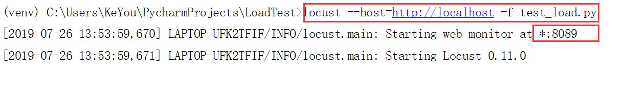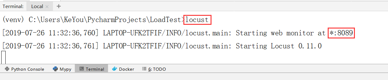 # 打开Pycharm Terminal控制台 # 运行如下命令: locust运行之后,控制台会在本地监听一个端口