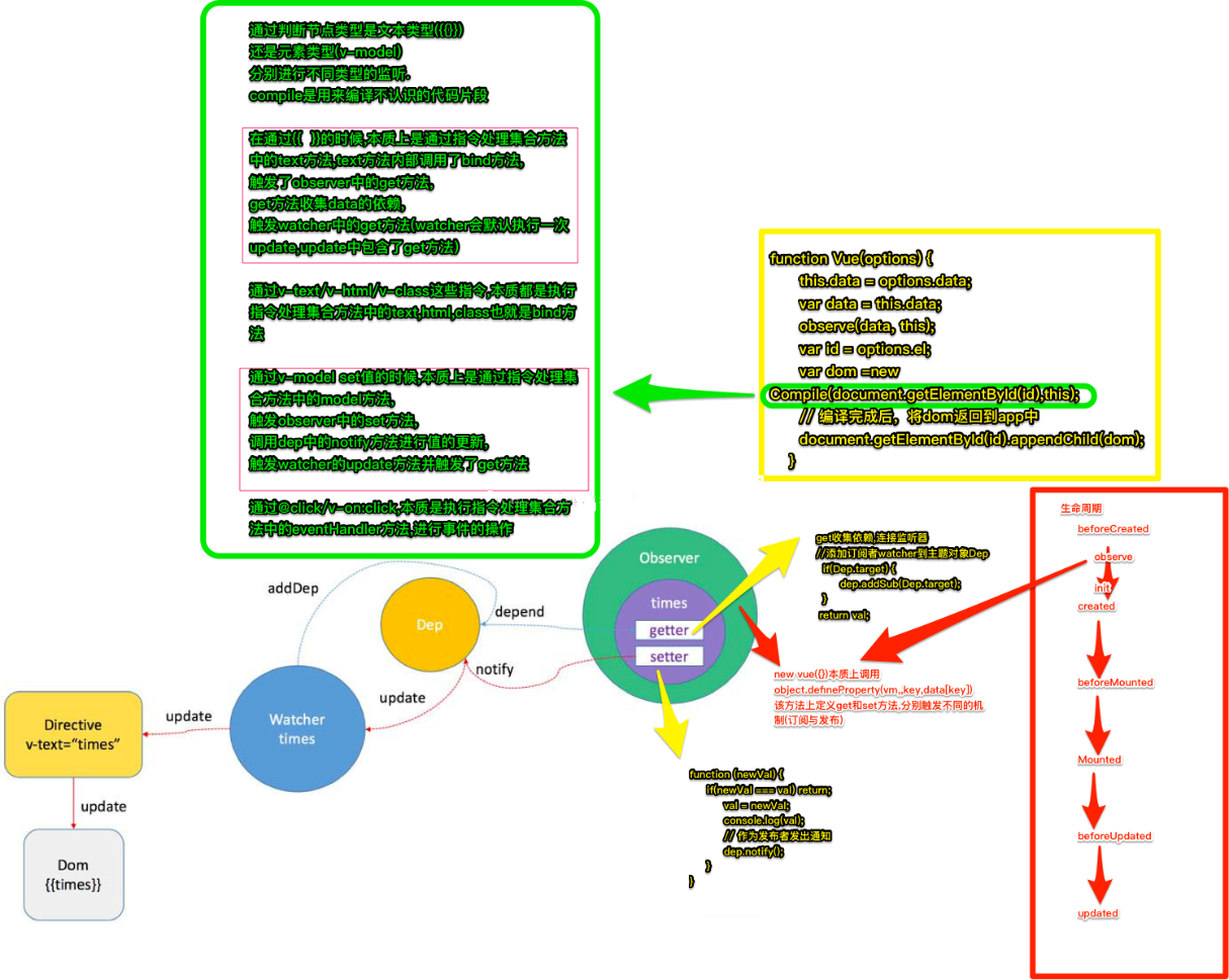 observe -> 触发setter -> watcher -> 触发update -> Directive -> 触发update -> 指令(如上图流程所示)