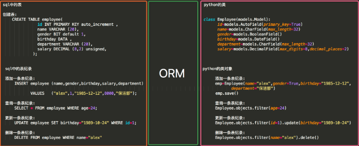 - 类对象--->sql--->pymysql--->mysql服务端--->磁盘,orm其实就是将类对象的语法翻译成sql语句的一个引擎,明白orm是什么了,剩下的就是怎么使用orm,怎么来写类对象关系语句。