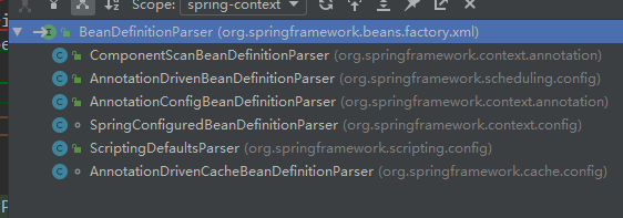 这里就不一一列举了,所以大家知道了,每个xml元素的解析器,都是实现了BeanDefinitionParser,这个接口的方法,就是交给各个子类去实现:针对指定的xml元素,如何获取到对应的bean definition。