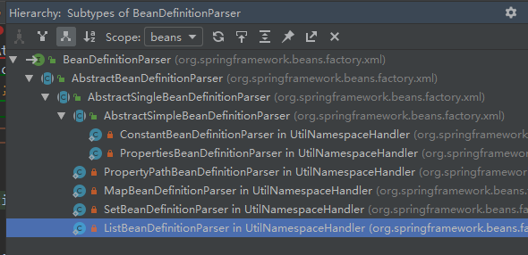 在UtilNamespaceHandler中,我们看看该元素对应的BeanDefinitionParser是啥: