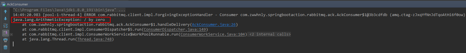 我们先将autoAck参数设置为ture,即自动确认,并在消费消息时故意写个异常,然后先运行生产者客户端将消息写入队列中,然后运行消费者客户端,发现消息未消费成功但是却消失了:
