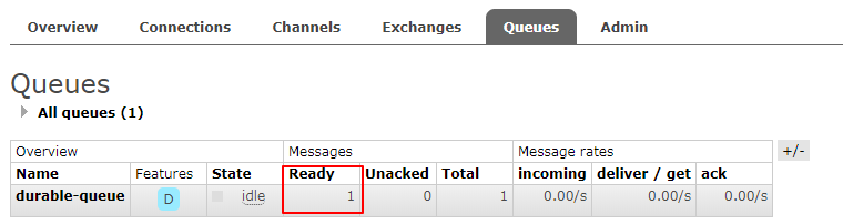 - 已经投递给消费者,但是还没有收到消费者确认信号的消息(下图中的Unacked部分)