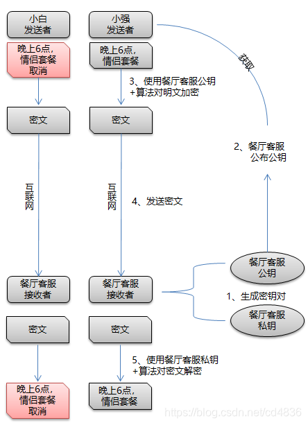 假设小白作为黑客,他想破坏小强的约会,向餐厅客服发消息,取消晚上6点的定餐。小白也使用了餐厅客服的公钥加密信息发送给了餐厅客服,餐厅客服通过自己的私钥解密后,得到了两种不同的结果,那他就晕了,到底哪一个消息才是真的呢?现代密码技术为了解决这个问题,引入了消息认证,其底层的技术就是哈希函数,也叫做单向散列函数。