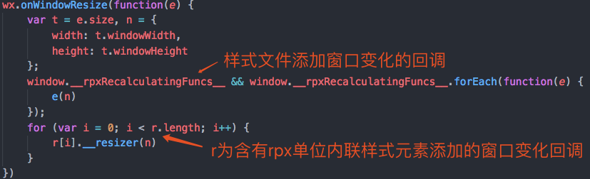 然后,在小程序基础库WAWebview内部初始时会使用wx.onWindowResize(fn)来注册窗口变更的事件回调,注册事件内部会执行window.__rpxRecalculatingFuncs__中的回调,具体代码如下图: