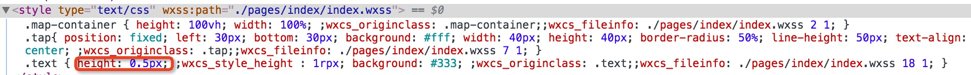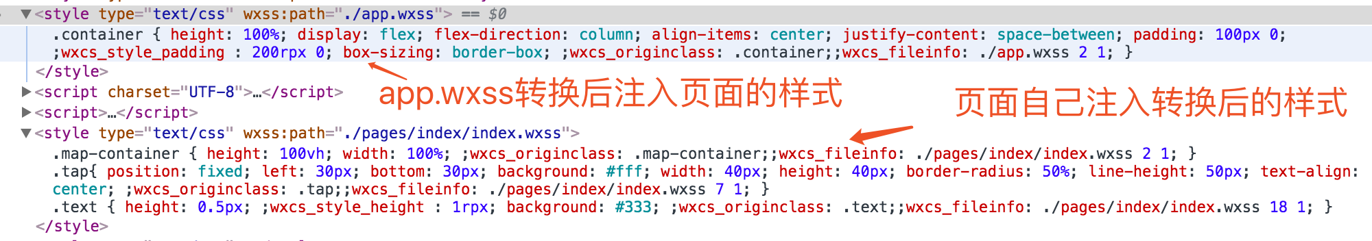 在从微信小程序开发者工具源码看实现原理(二)- - 小程序技术实现中可以知道,小程序中的wxss样式文件进行的主要转换转换rpx单位,视图层模板注入转换后的wxss代码如下图:
