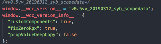 通过获取window.__wcc_version_info__.fixZeroRpx的值来判断rpx为0时如何转换;而window.__wcc_version_info__的定义赋值是在wcc可执行命令转换wxml文件生成的js脚本中完成的,下面是wcc生成有关赋值代码: