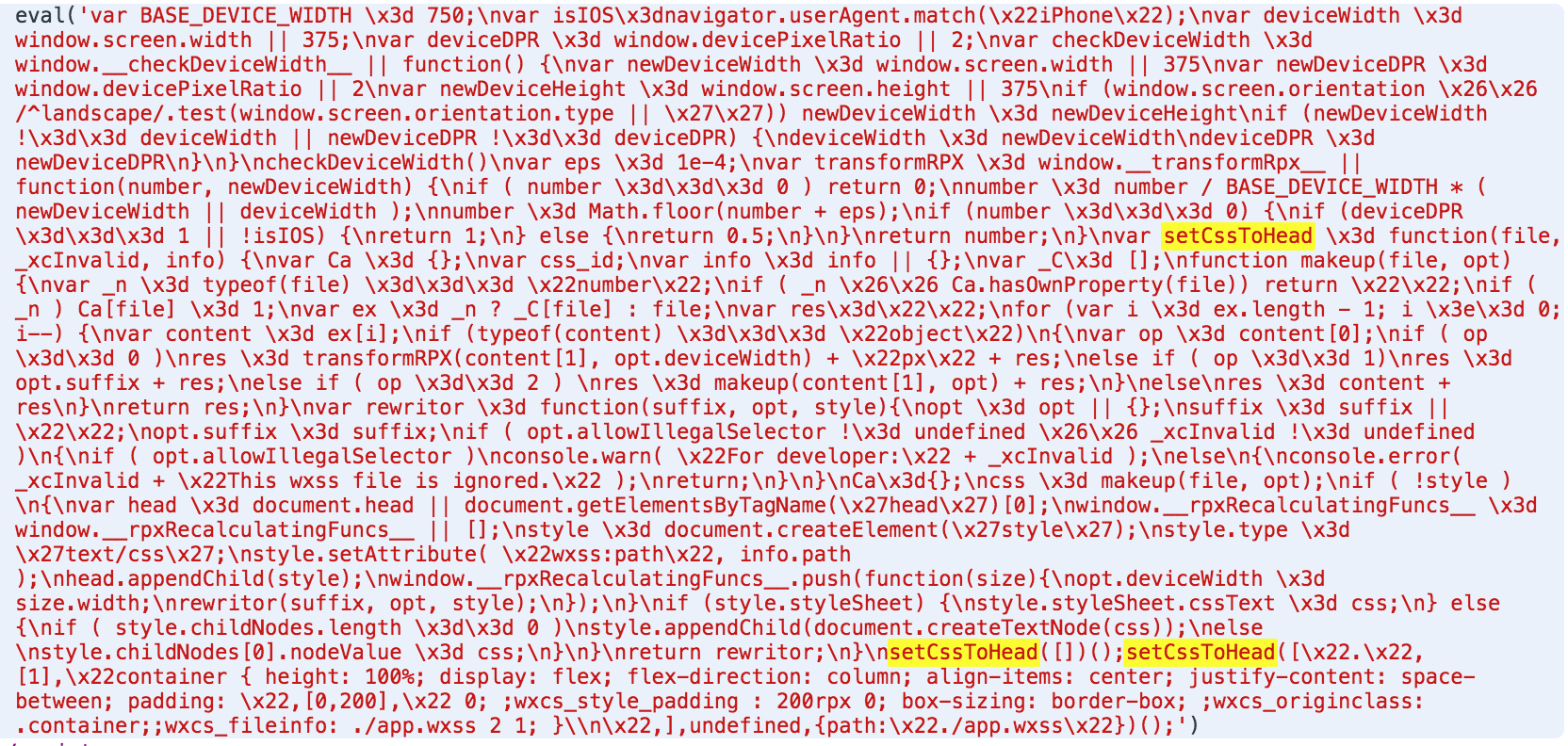 首先,在视图层,wxss样式文件经rpx初始转换后并将样式注入到页面过程中,会向window.__rpxRecalculatingFuncs__数组中收集窗口变化时的回调;先看wcsc可执行程序输出的处理rpx转换相关的setCssToHead函数实现,其最终返回rewritor函数,对应代码如下图: