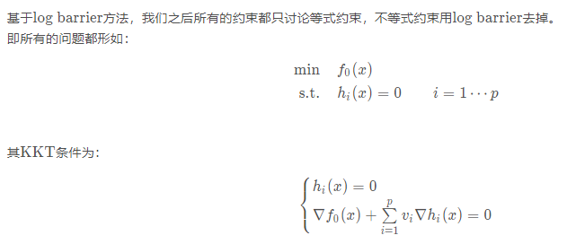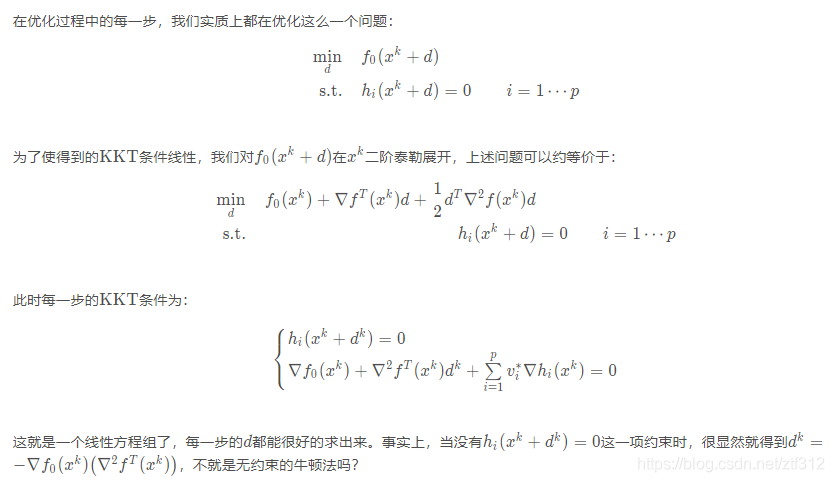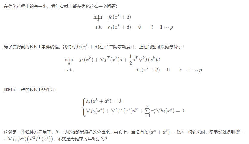 直接解一个非线性方程组往往是比较棘手的问题,牛顿法的思路就是将解一个非线性的KKT条件转换为解许多线性的方程组,具体就是将求解分为很多步,每一步都有一个当前的KKT条件,用一个泰勒展开去构造一个近似问题,而这个近似问题的KKT条件是线性的。这样,通过不断迭代,我们最终能得到最优解。