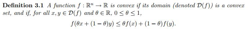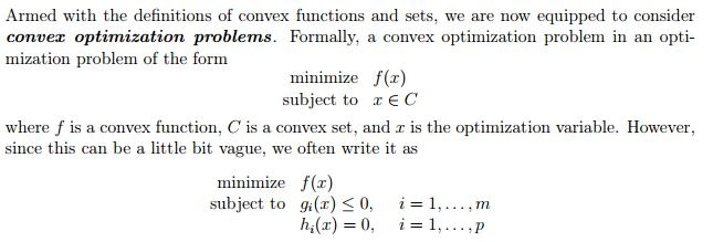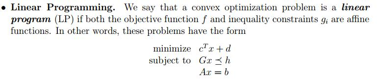 即要求目标函数是凸函数,变量所属集合是凸集合的优化问题。或者目标函数是凸函数,变量的约束函数是凸函数(不等式约束时),或者是仿射函数(等式约束时)。