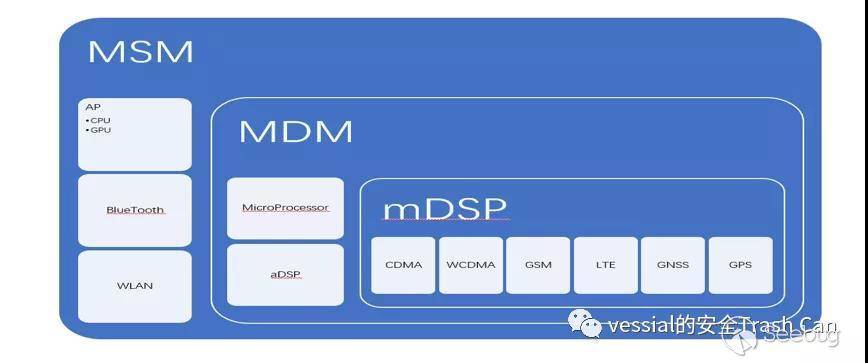 MDM系列早期只包含(Baseband Processor),主要是提供数据modem和语音的功能,苹果手机生态和车联网以及4G无线上网卡等应用中比较常见,比如iPhone8/8 Plus和iPhone X都是配备的高通MDM9655的基带芯片,而宝马/奥迪车联网的TBOX则配备的MDM6x00系列的基带芯片,而15年生产的通用安吉星系统TBOX则采用的是MDM9215系列,为了能够提供更强大的业务逻辑能力,MDM系列基带芯片SoC剥离了基带系统和业务系统,由两个core组成,比如mdm9xxx系列芯片包含一个hexagon的DSP基带处理核,以及一个ARM Cortex-A系列的核。