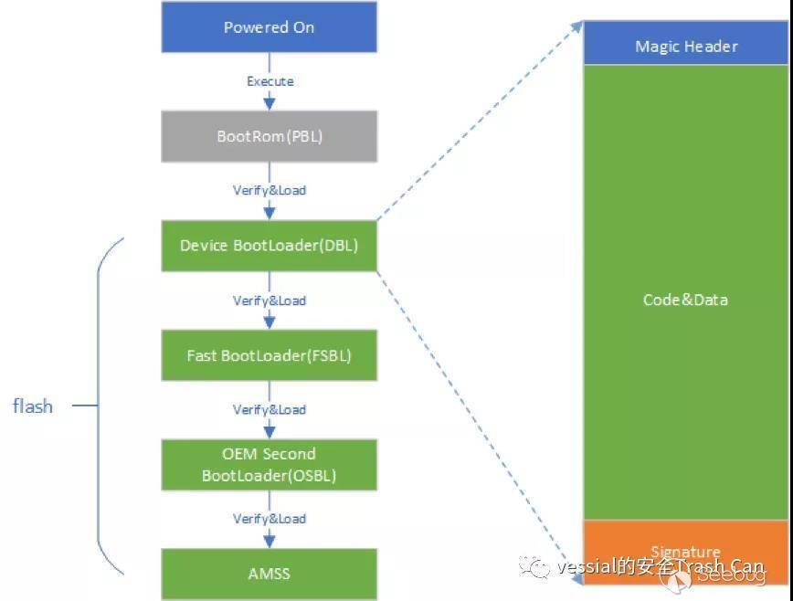 当BootRom验证DBL代码和数据签名成功后,此后DBL的代码接管执行,然后搜索MIBIB分区表,获取各个分区的起始block信息,然后在相应的块去读取相应的数据,接着就是验证相应分区数据的签名,然后相应的分区代码接管,完成一系列的信任启动链,DBL验证成功后,验证FSBL,然后是OSBL,最后是AMSS。