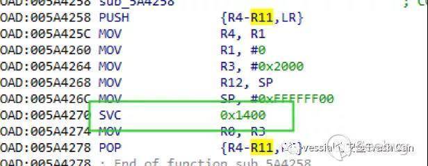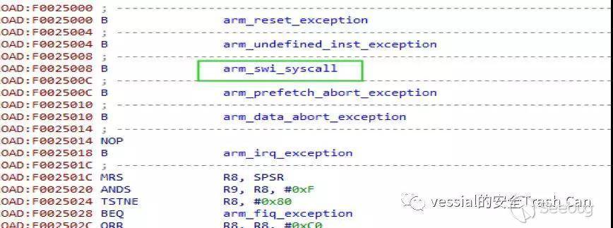 当基带系统的安全信任启动链验证完成后,最后系统被AMSS系统代码接管, AMSS系统定义了代码执行的内核特权模式以及AMSS应用模式,设置页表(映射硬件外设地址到页表中)并且开启MMU(内存管理单元),在某些敏感的内存地址区域通过MPU的特性来进行保护,只有特定权限的应用的可以访问,应用模式的代码想要进入内核态(例如IPC消息发送),可以通过设置的特权中断指令SVC进入内核态,下图就是进入特权syscall的中断向量表入口。