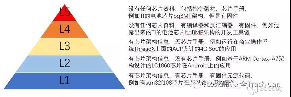 逆向工程也分软件和硬件,现今的数字系统基本上都是通过软件来定义的,我们对于硬件的逆向工程就不展开讲了,有机会单独写出来,所以本文讨论的也基本上是软件层面上的逆向工程,而基带系统与硬件结合又是非常紧密的,所以对基带系统的逆向工程也需要硬件研究能力的支撑,逆向工程的难易程度也是分等级的,如下是我个人对逆向工程难易的理解,默认下面所有应用的固件都可以获取,通过研究工具的获取和研究的成本来分类。