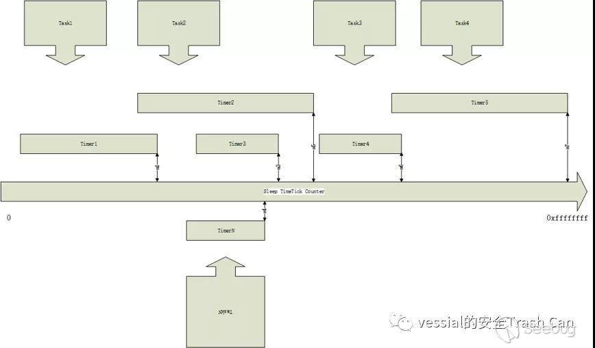 当timetick的计数到达某个定时任务的Match value的时候产生中断,中断处理例程ISR会通过向DPC(Deferred Procedure Calls)发送执行定时任务的消息去执行该定时任务的例程函数,如果只是延时任务就不需要执行了,同时更新timetick的下一次中断产生的match value,并把这个定时任务从定时任务列表中移除