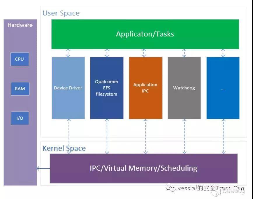 微内核的好处在于,应用系统可以保持高度的可移植性,微内核系统只要满足基本的IPC通信机制,内存管理,CPU调度机制即可,驱动文件系统等以及应用都可以在用户态来初始化完成,这对于需要支持多个硬件平台的高通来说无疑非常高效的做法,如下图是高通的系统架构。