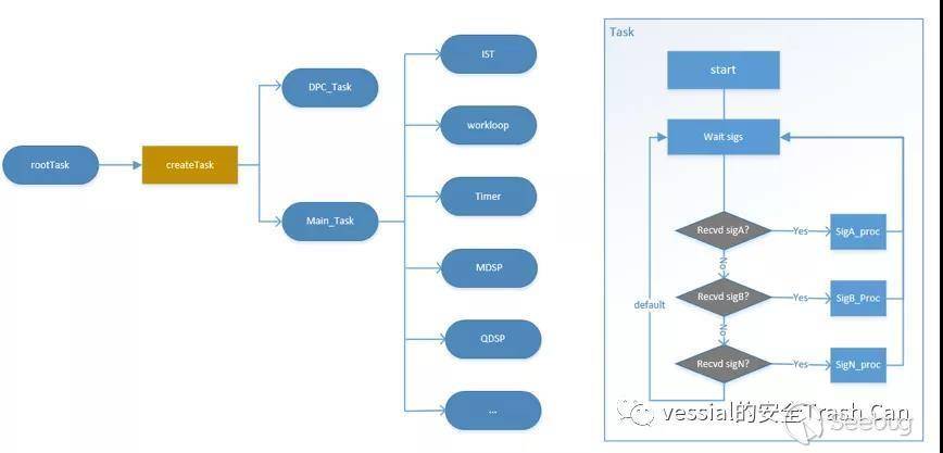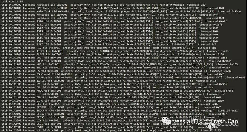 上面提到基带系统从内核态切入到应用态会创建第一个rootTask应用任务,这个任务有点类似linux系统里面的init进程,rootTask接下来会创建应用权限很高的DPC_task任务(负责高实时异步任务执行),权限仅次于IST(interruptservice threads,中断服务接管线程),然后是应用层的全局管理任务main_task将会启动,接下来业务所需的各种驱动相关的初始化和通信业务逻辑任务将在main_task任务中得以创建,例如中断接管服务相关的IST(interruptService Threads),定时器业务相关的timer_task,qualcommEFS文件系统相关的fs_task,任务监控相关的watchdog_task,以及GSM/UMTS业务相关的通信层面的各个任务。