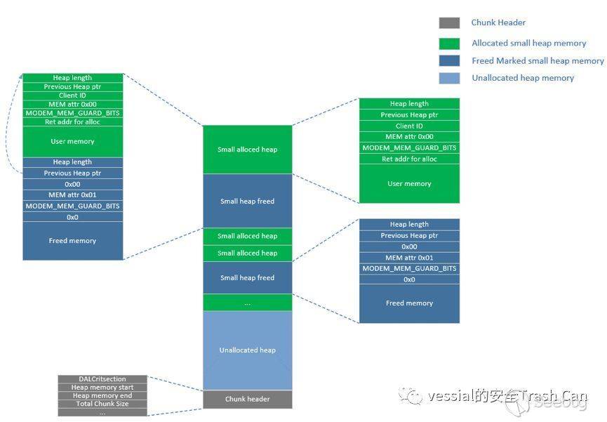 - 大堆类型2,(modem chunk),也是一个连续内存区域,但是chunk header在内存的底部,上部为分配小堆区域,分配顺序也是从上往下分配,小堆的头部数据结构中会指向上一个已经分配好的小堆,通过单向链表进行小堆内存的回溯,最上面的小堆回溯指针为空,但是它的内存分配算法跟上面的不同,就算要被释放的小堆内存和空闲块不挨着,但是它任能在下一次的堆内存申请中被重用,只要它的大小合适,而且小堆数据结构与类型1也不同,基本结构如下图。