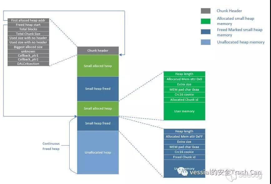 大堆在不同应用初始化的时候指定内存的起始地址与长度,而且根据应用功能的不同,分配方式也不同,小堆将会在大堆上进行分配使用,大堆由于给使用的应用不同,分配小堆的方式有所不同。