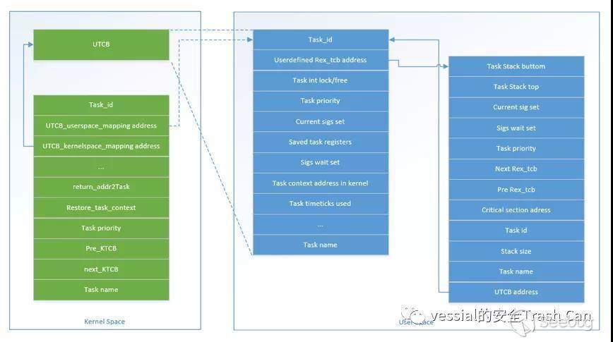 每个任务被创建时,REX内核和用户态各自会维护一套数据结构,以及用户自定义的一套TCB结构: