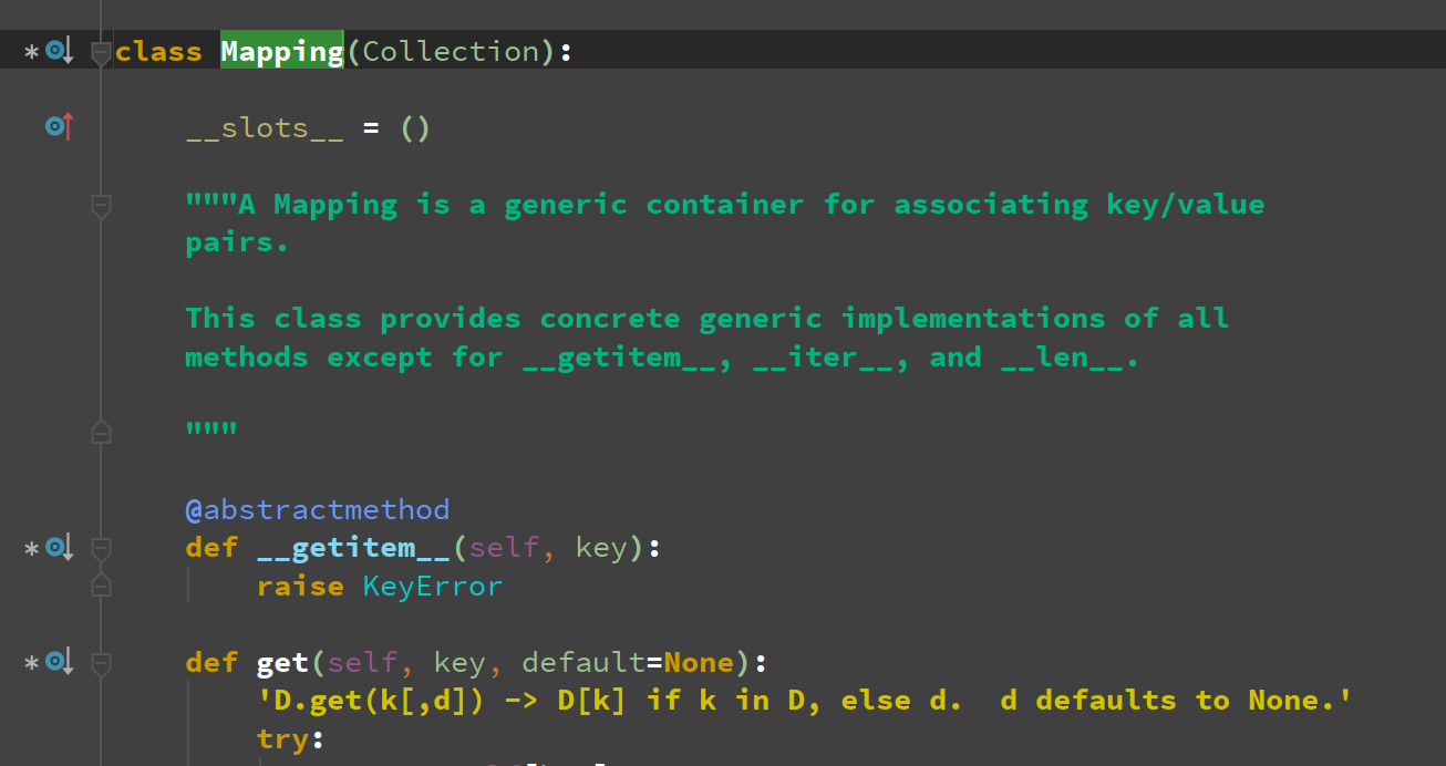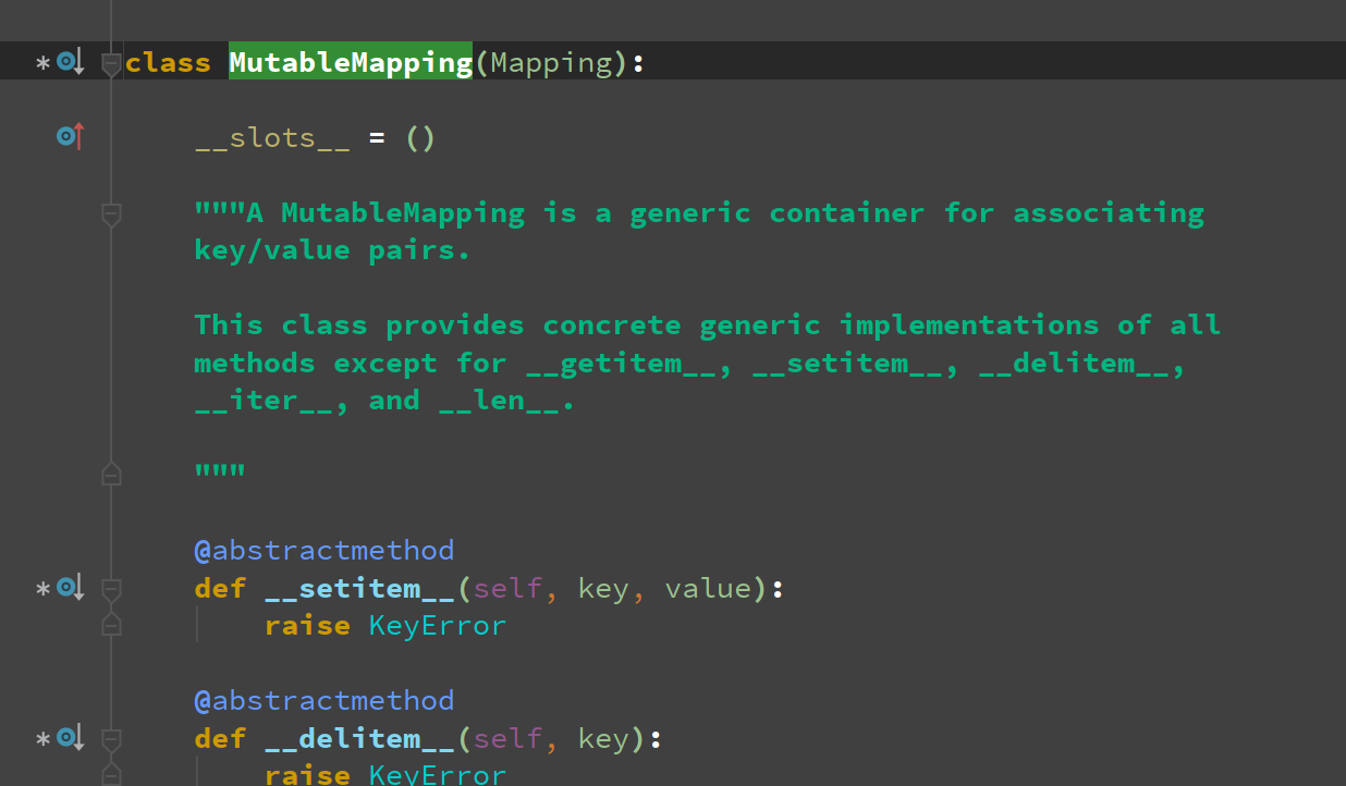 跟上篇对可变序列类继承的分析一样,MutableMapping继承了Mapping的一些功能并且加了一些可变的特性,