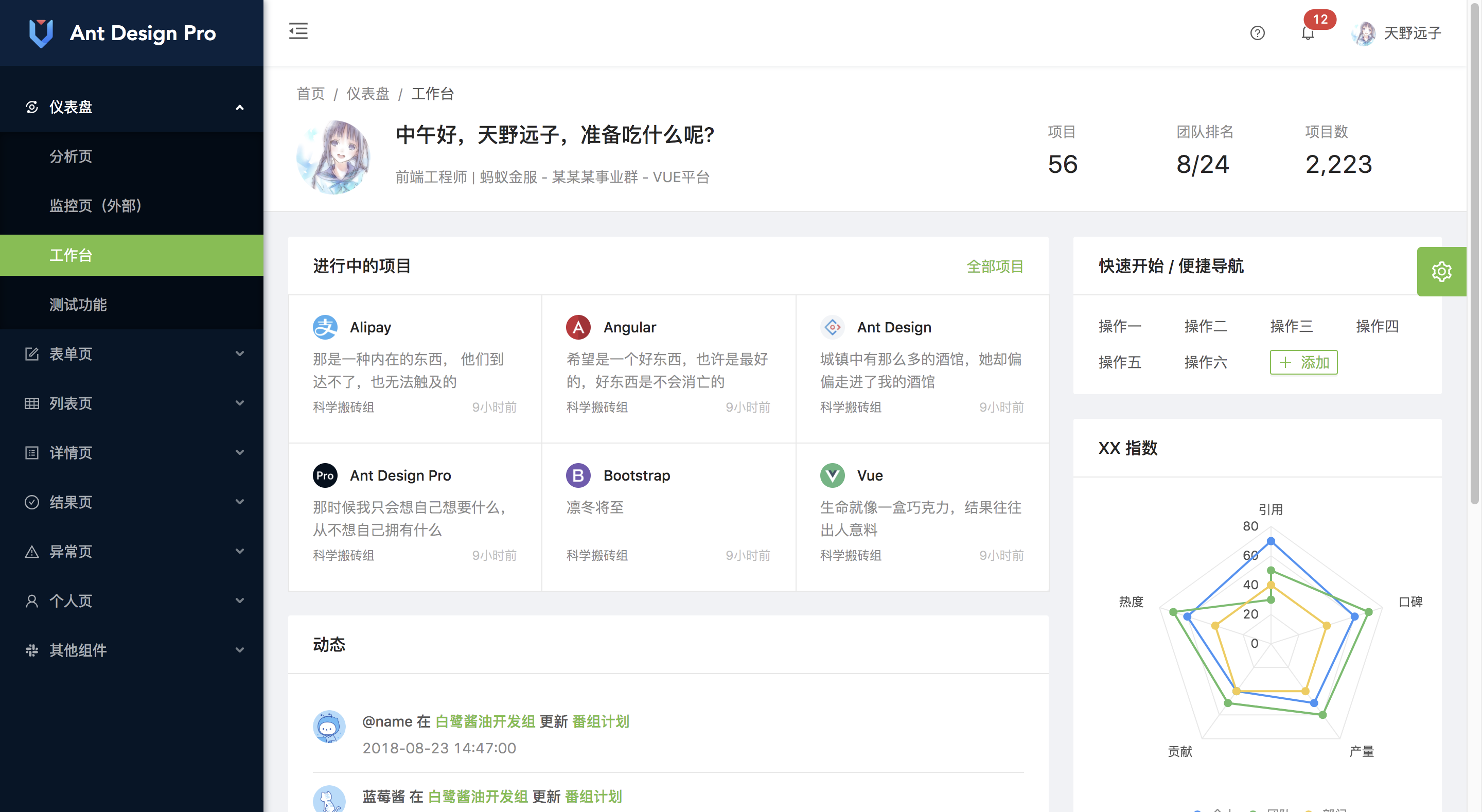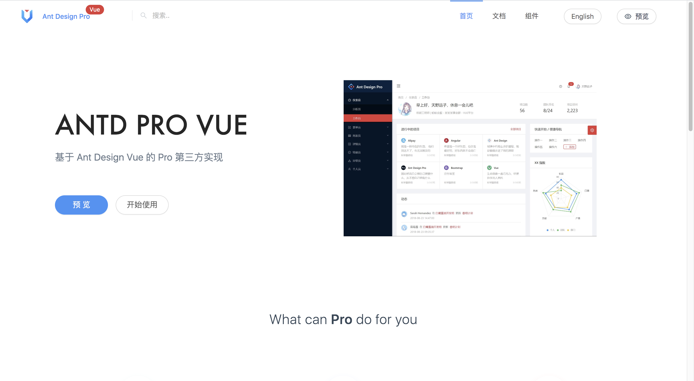 官网:https://pro.loacg.com/ 演示地址:https://preview.pro.loacg.com/dashboard/workplace 来源:oschina链接:https://my.oschina.net/mj20200214/blog/3274141 标签 Ant Design Pro Ant Design Vue