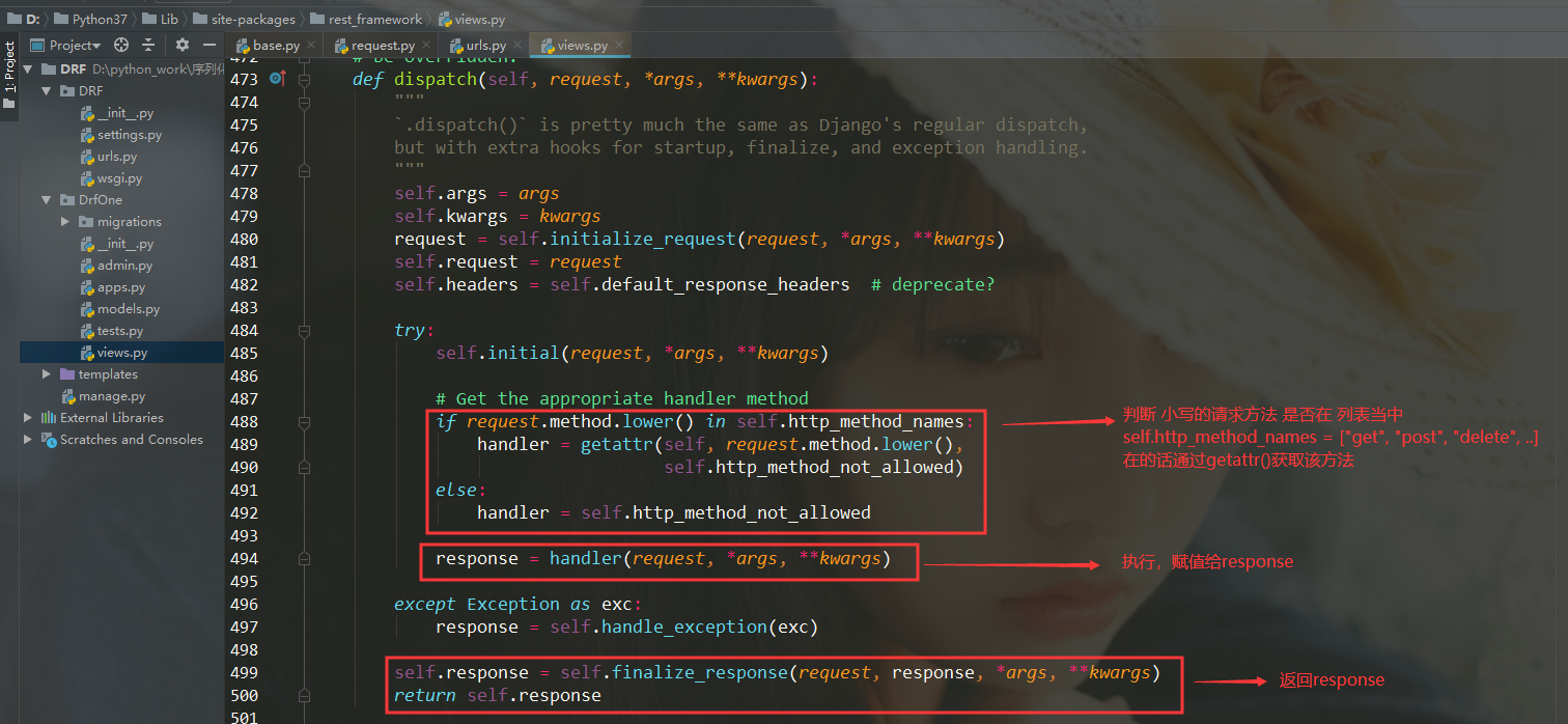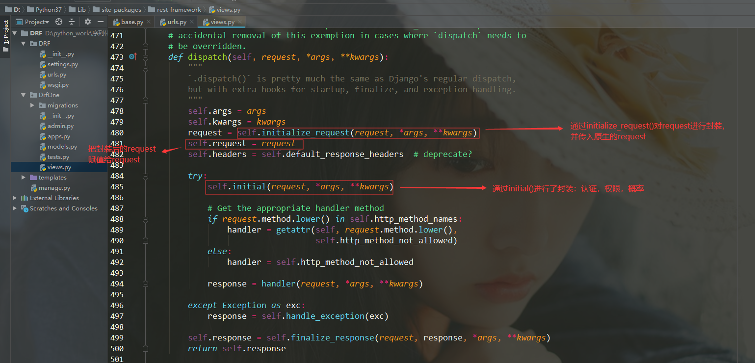 DRF的关键就是重写了 dispatch 方法,在 dispatch 中对原生的 request 进行了封装,然后通过 initial() 方法来执行认证,权限,频率的控制。