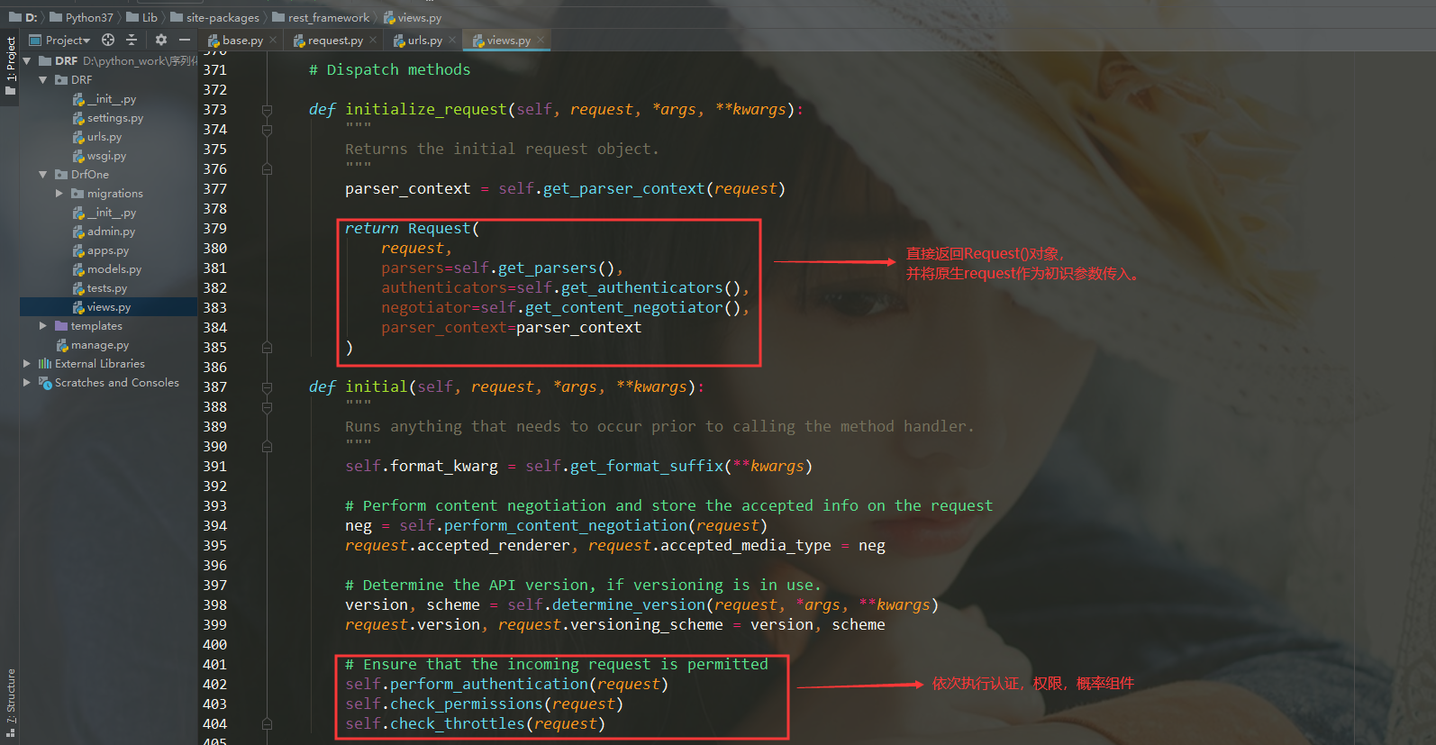 4. 通过 initialize_request() 将原生 request 封装到 Request 中,依次执行 initial() 里面的认证,权限,概率组件