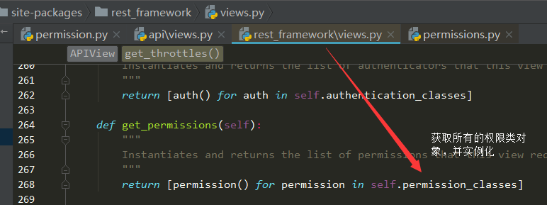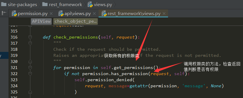 在这里可以看到和认证中有类似的操作,获取所有的权限类,并且执行每一个权限类的<code>has_permission()</code>方法,而这个方法具体封装了我们的判断权限操作,但是<code>has_permission()</code>方法的返回值需要时<code>False</code>或者<code>True</code>, <code>self.permission_denied(request, message=getattr(permission, 'message', None))</code>说明可以在权限类中重写<code>message</code>属性,来定义权限不通过时候的提示信息。