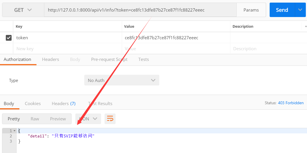 这里的<code>UserInfoView</code>重写了<code>permission_classes</code>属性,则不会再使用<code>settings.py</code>中关于认证类的配置。表示只有SVIP才能访问这个类的内部。