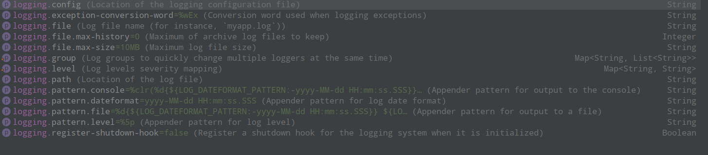 以上的示例中,都是用的 SpringBoot 默认的日志属性,当然,这些属性可修改,下图是属性列表,可以根据自己的需求进行自定义。