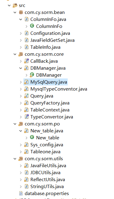 SORM框架是一个简单的ORM,关系对象映射,可以通过这个框架方便的更改和操作一些数据库的东西,在框架运行的时候也会根据数据库中的表生成相应的Javabean在po包下。通过直接对po包下的操作在运用query中的一些操作就可以实现对数据库的操作。思路会在代码中注释。