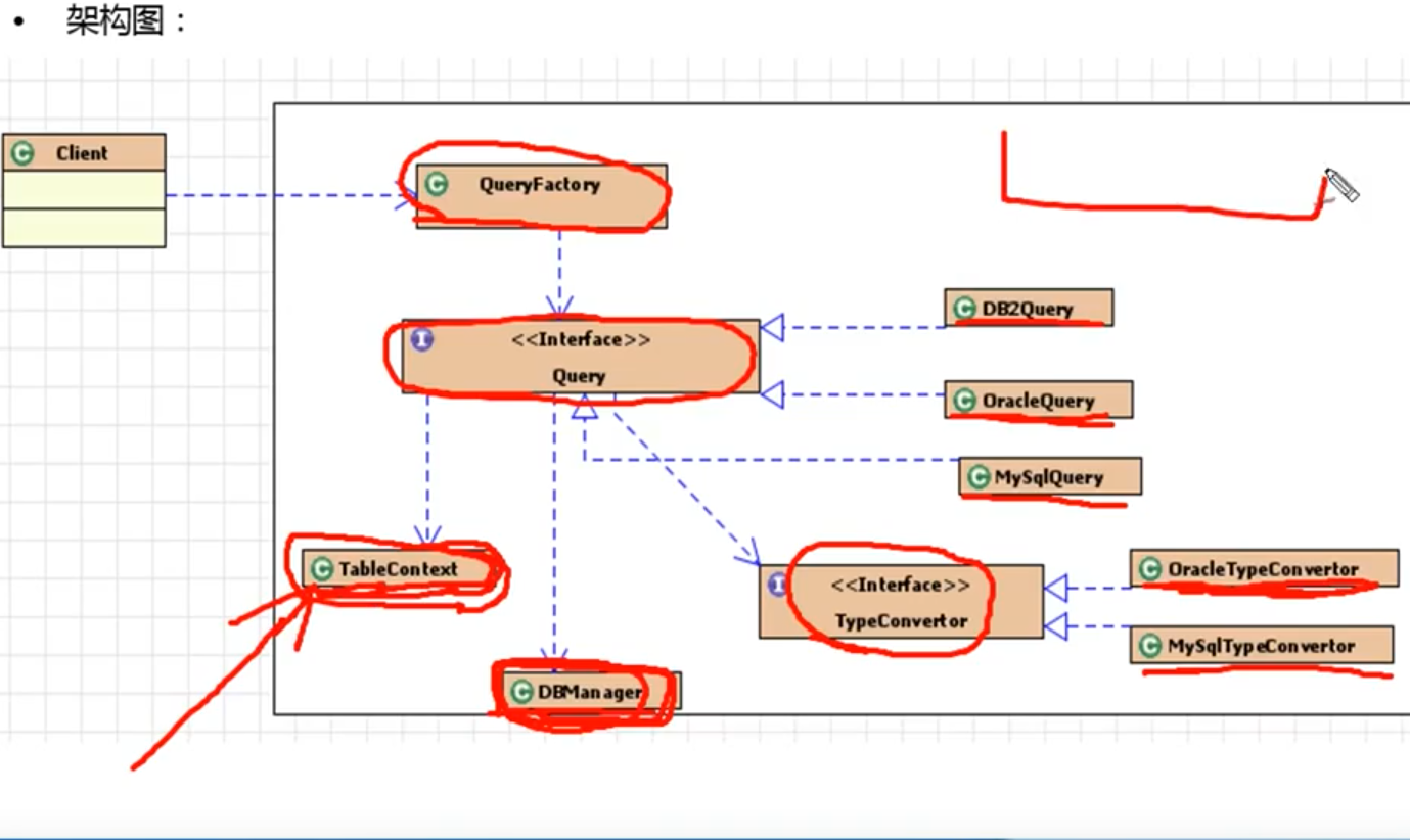 QueryFactory直接生产出Query给用的人调用,Query作为一个接口是更好的让多种数据库提供各自的操作。实现mySQLQuery或者OracleQuery,conventor是个转换不同语言数据类型的工具
