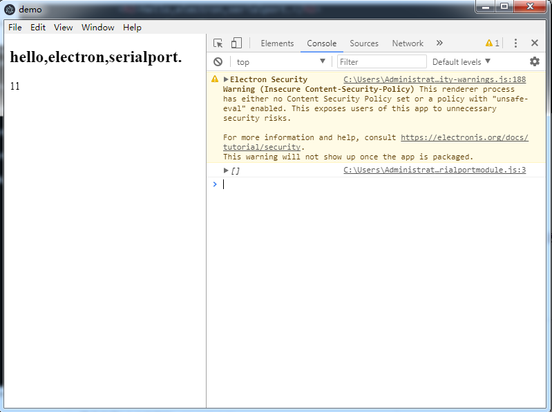 控制台只是打印了一个空数组,因为电脑没有连接串口设备, 但是没有报错,证明electron与serialport结合是没有问题的。